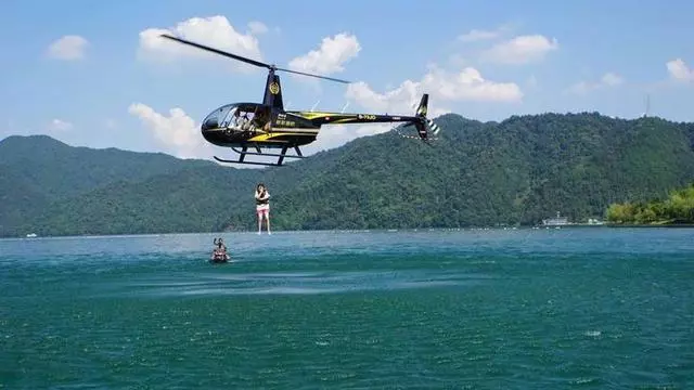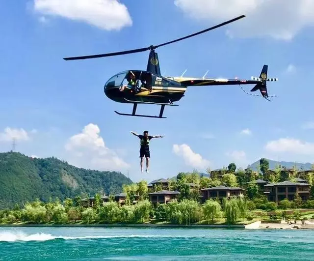 顾名思义,直升机跳水就是人从悬停的直升机上跳出,在空中经过一段自由落体后,进入千岛湖清澈凉爽的湖水之中。