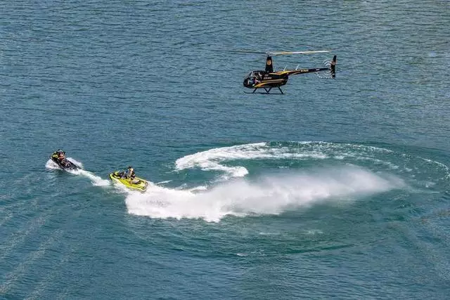 挑战者先乘坐直升机到达高空,准备完毕后,站在直升机的滑撬上,从水面上空约5米处一跃而下,短短几秒钟内,就从直升机上跳入水中。