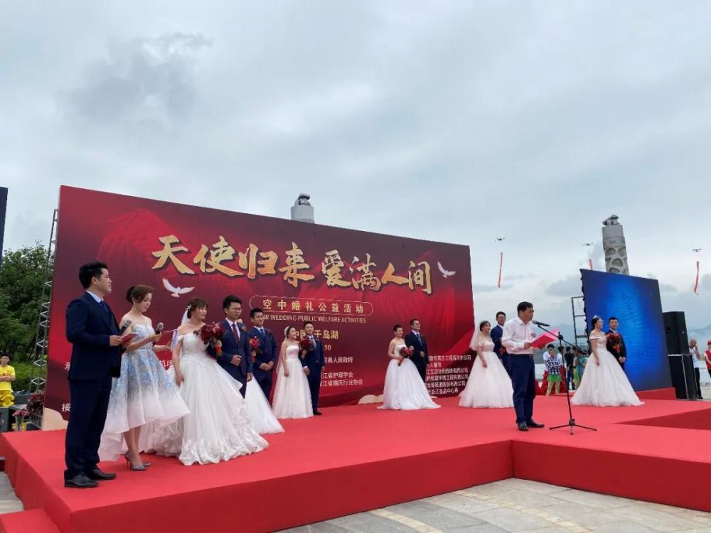 国际护士节前夕,5月10日上午10点,参与抗疫的6对新人在千岛湖珍珠广场参加“天使归来 爱满人间”空中婚礼。今天新人们穿上洁白的婚纱和帅气的西装,完成了人生中最重要的一场仪式,实现了“援鄂归来,我们就结婚”的愿望,兑现了爱的承诺,新娘乘座的新联通航直升机分别降落在婚庆现场,在亲朋好友的见证下,喜结连理,接纳祝福。
