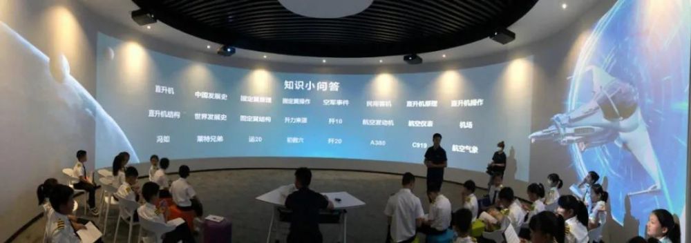 在沉浸式体验厅学生们观看爱国主义教育影片,总结中国在航空强国的道路上作出的努力,接受爱国主义教育,增强未成年人思想道德建设。